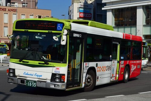 所属-国際興業さいたま東営業所 社番-5233 登録ナンバー-大宮200 か1855 型式-いすゞエルガ PKG-LV234L1 年式-2009年 備考-コープデリ 車体広告 2008年~2010年頃にかけて導入された、社5200台の車両です。 現在は車体広告車として運行されています。